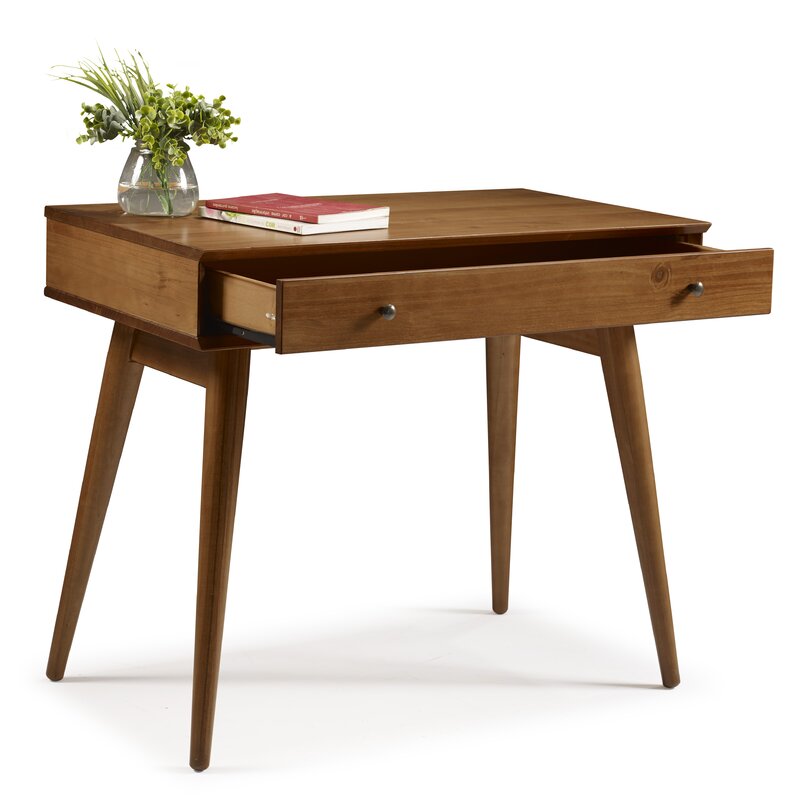 Whether finishing up a DIY project or penning your next big novel, this writing desk is here to help. Crafted from Brazilian pine wood, it's perched atop slightly splayed legs for a look that works well in any mid century modern setting. A single drawer on metal roller glides provides a place to tuck away papers, pens, pencils, and more, while the spacious top offers plenty of workspace. Plus, a neutral finish allows it to blend with a variety of color schemes.