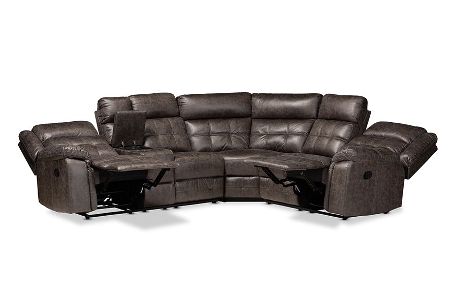 Create the ultimate hang out spot in your living room with this sectional sofa. Constructed from sturdy poplar wood and steel, upholstered in a sleek, distressed leather like polyester fabric and padded with foam for plush comfort. This 6 piece sectional includes two armless chairs, one corner wedge, and two armchairs equipped with manual recline capability for the utmost relaxation. Each seat back displays contrast stitching for a touch of texture and definition. Also features a console fitted with two beverage holders so you can enjoy your favorite drinks as you relax. Available in either RAF or LAF configuration.